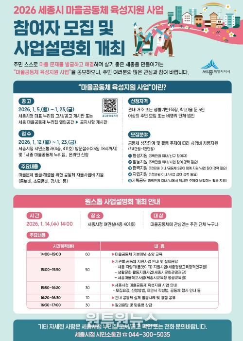 (원투원뉴스) 세종특별자치시가 오는 12일부터 23일까지 ‘2026년 마을공동체 육성지원 사업’ 참여자를 모집한다.