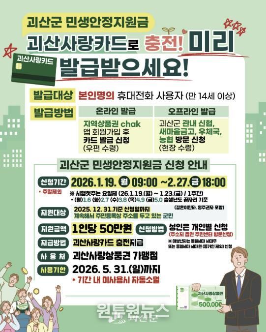 (원투원뉴스) 충북 괴산군은 군민 생활 안정을 지원하고 위축된 지역경제에 활력을 불어넣기 위해 오는 19일부터 군민 1인당 50만원의 민생안정지원금을 지급한다고 밝혔다.