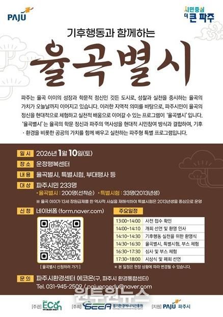 (원투원뉴스) 파주시환경센터 에코온은 파주를 대표하는 조선시대 사상가 율곡 이이의 학문 정신을 현대적 기후행동 가치로 재해석한 기후문화축제 ‘기후행동과 함께하는 율곡별시’를 오는 10일 운정행복센터에서 개최한다고 밝혔다.