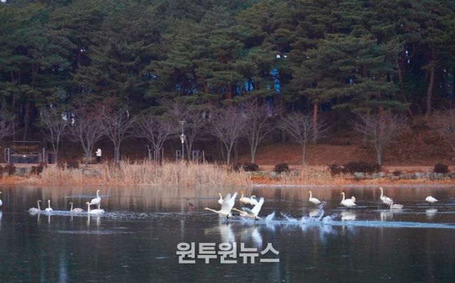 (원투원뉴스) 맑게 갠 하늘 아래 울진군 연호공원에서 겨울 철새 고니가 힘차게 날아오르고 있다.