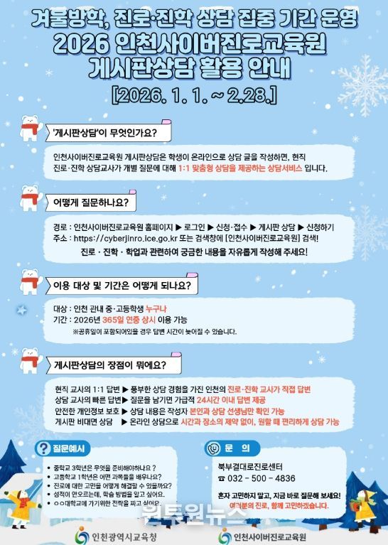 인천시교육청 관계자는 “인천사이버진로교육원 게시판 상담은 학생들이 혼자 고민하기 쉬운 진로·진학 문제를 현직 교사와 함께 해결할 수 있는 지원 창구”라며 “겨울방학 동안 학생들이 자신의 진로를 탐색하고, 새 학년을 준비하는 데 도움이 되길 기대한다”고 말했다.