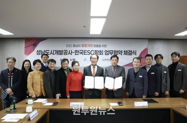 (원투원뉴스) 성남도시개발공사는 지난 8일 한국ESG학회와 ESG경영 실천 문화 확산과 지속가능한 공공가치 창출을 위해 업무협약(MOU)을 체결했다고 9일 밝혔다.