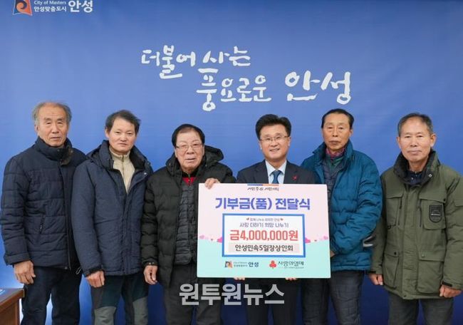(원투원뉴스) 안성시는 1월 8일 민속오일장 상인회로부터 400만 원의 성금을 전달받았다고 밝혔다. 전달식에는 상인회 임원진과 시 관계자가 참석한 가운데 진행됐다.