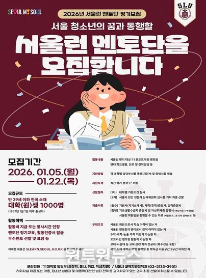 (원투원뉴스) 서울시는 대학생들이 자신의 지식과 경험을 나누며 장학금 혜택과 취업 역량까지 쌓을 수 있는 ‘서울런 멘토단’ 신규 멘토 1,000명을 22일까지 모집한다.