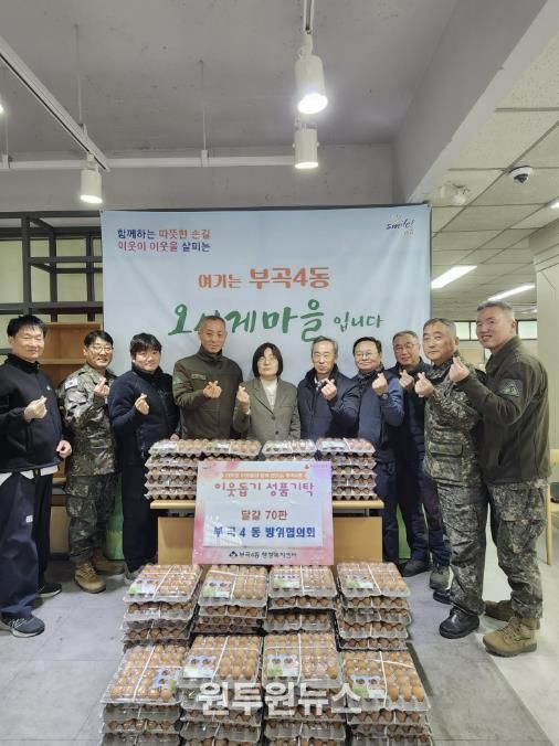 (원투원뉴스) 부산시 금정구 부곡4동 방위협의회는 새해를 맞아 지난 9일 지역 내 저소득 이웃을 돕기 위해 달걀 70판을 부곡4동에 기탁했다.