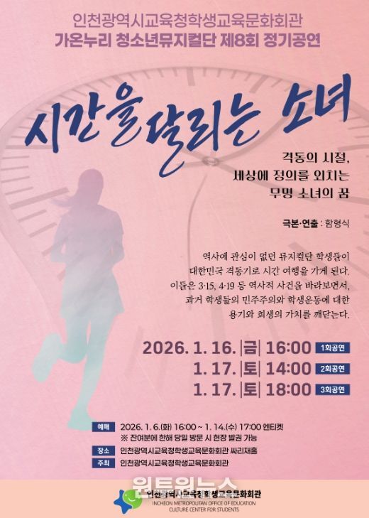 (원투원뉴스) 인천광역시교육청학생교육문화회관은 가온누리 청소년뮤지컬단 제8회 정기공연 ‘시간을 달리는 소녀’를 16일부터 17일까지 싸리재홀 대공연장에서 개최한다.