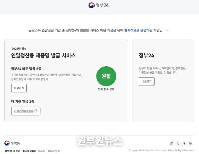 행정안전부는 연말정산 기간에 이용자 접속이 급증할 것에 대비해 전용창구를 운영하고, 접속 폭주 시 순번 대기 표시기능을 적용하는 등 이용자 불편을 최소화하여 정부24 운영의 안정성을 높인다는 계획이다.