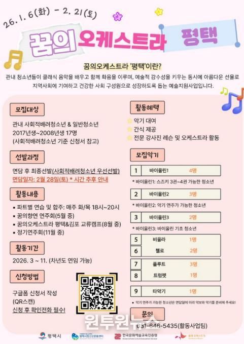 (원투원뉴스) 평택시가 (재)평택시청소년재단에 위탁 운영하고 있는 평택시청소년문화센터는 관내 청소년을 대상으로 클래식 음악 교육을 통해 예술적 감수성과 협동심을 기르는 ‘꿈의 오케스트라 평택’2026년 신규단원을 모집한다고 밝혔다.