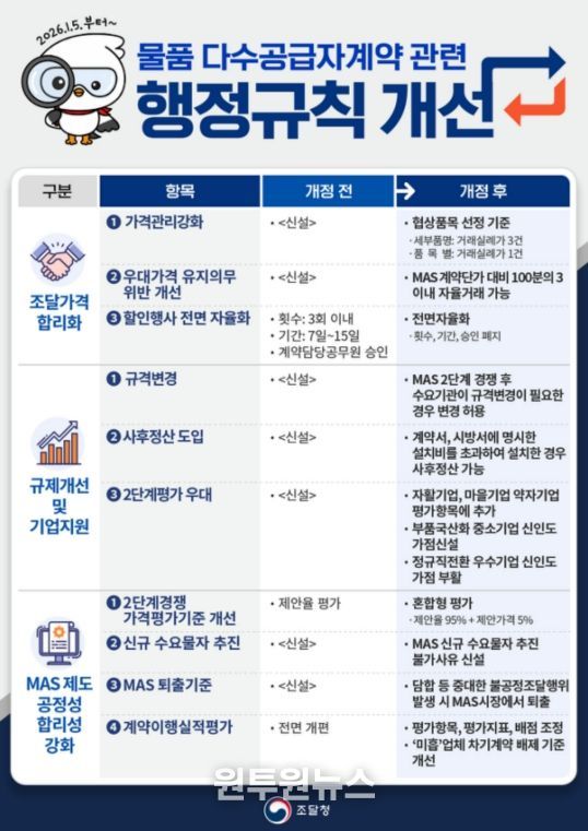 (원투원뉴스) 조달청은 조달 가격의 신뢰성을 높이고, 공공조달에 남아 있는 불합리한 규제를 혁파하기 위해 '물품 다수공급자계약 관련 행정규칙 2종'을 개정하여 2026년 1월 5일부터 시행했다고 밝혔다.
