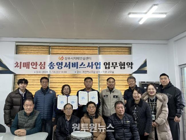 (원투원뉴스) 상주시치매안심센터는 1월 14일 경북개인택시운송사업조합 상주시지부와 ‘치매안심 송영서비스’ 운영을 위한 업무협약을 체결하고, 치매어르신의 안전한 이동 지원을 위한 협력체계를 구축했다.