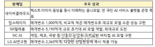 `25년 8월부터 「독자 AI 파운데이션 모델 프로젝트」 정예팀에 선발된 5개 팀이 치열한 경쟁을 통해 기술 혁신을 거듭한 결과, 정예팀이 개발한 AI 파운데이션 모델(`25년말 공개) 5개 모두 미국 비영리 AI연구기관 ‘Epoch AI’의 ‘주목할만한 AI모델(Notable AI Models)’로 등재되는 성과를 거두었다.