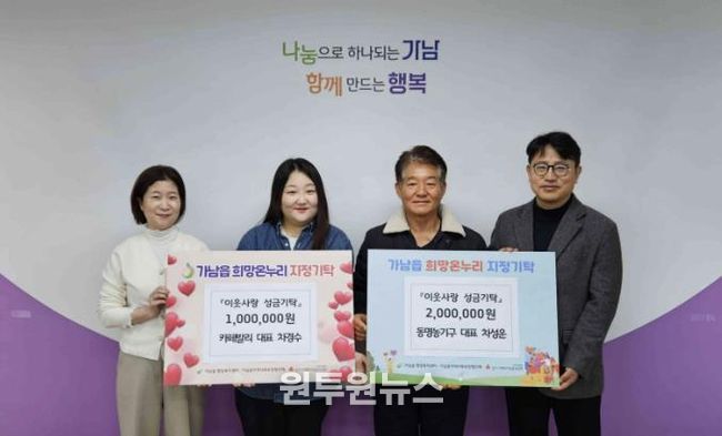 (원투원뉴스) 여주시 가남읍 행정복지센터은 지난 15일, 관내 사업체인 동명농기구와 카페 발리에서 지역 내 취약계층을 위한 이웃돕기 성금을 기탁했다고 밝혔다.