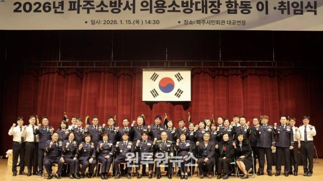 (원투원뉴스) 파주소방서는 1월 15일 파주시민회관 대공연장에서 『2026년 파주소방서 의용소방대 대장 합동 이·취임식』을 열고, 지역 안전을 위해 헌신해온 이임 대장들의 공로에 감사를 전하는 한편, 새로운 리더들과 함께 ‘의용’의 사명을 이어갈 뜻을 다졌다.