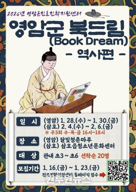 (원투원뉴스) 영암군진로진학지원센터가 겨울방학을 맞아 초등학생의 사고력과 표현력을 키우는 독서토론 프로그램 ‘영암군 북드림-역사편’ 참가자를이달 23일까지 모집한다.