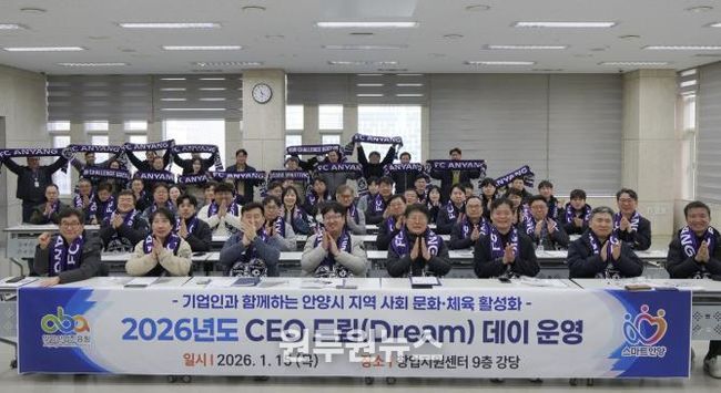 (원투원뉴스) 안양산업진흥원은 15일 오후 3시30분 안양창업지원센터 강당에서 관내 기업인 150여 명을 대상으로 지역사회 문화·체육 활성화를 위한 ‘2026 CEO 드림(Dream) 데이’를 열었다.