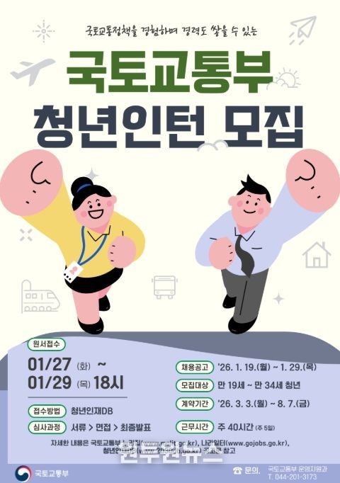 국토교통부는 ‘2026 상반기 청년인턴’을 선발해 국토교통 분야의 다양한 정책 현장을 경험하고, 정책이 실제로 기획되고 실행되는 과정에 청년의 시각과 아이디어가 반영될 수 있도록 운영할 예정이다.