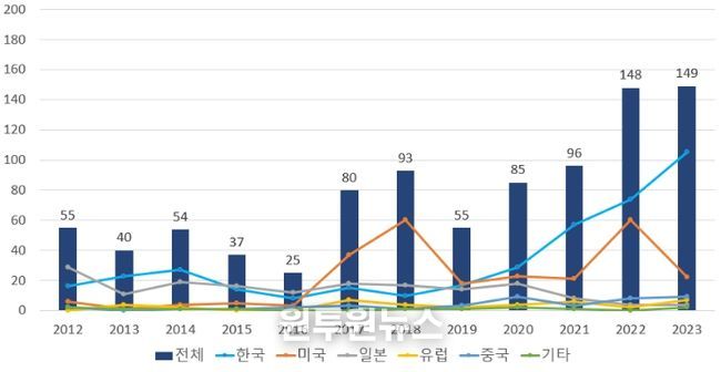 출원인 국적별로 살펴보면 출원량은 1위 한국이 43.1%(395건)으로 가장 많이 출원했고, 그 다음으로 2위 미국 28.4%(260건), 3위 일본 18.5%(170건), 4위 중국 4.6%(42건), 5위 유럽연합 4.1%(38건) 순이었다.