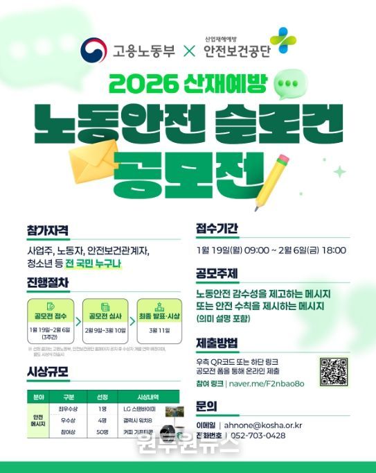 (원투원뉴스) 고용노동부와 한국산업안전보건공단은 1월 19일부터 우리 국민 누구나 참여할 수 있는 산재예방 노동안전 슬로건 공모를 실시한다.