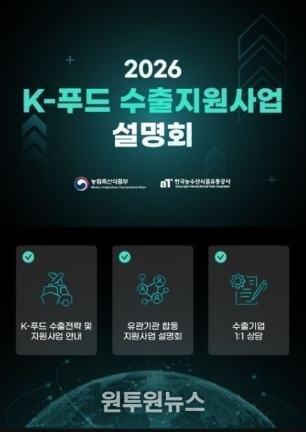 (원투원뉴스) 농림축산식품부는 K-푸드의 글로벌 진출 확대를 위해 전년보다 900억원 증가한 7,070억원 규모의 2026년 K-푸드 수출지원사업 설명회를 1월 23일 서울 과학기술컨벤션센터에서 개최한다고 밝혔다.