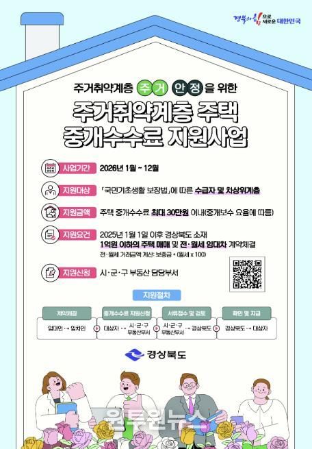 (원투원뉴스) 상주시는 주거 취약계층의 경제적 부담을 완화하고 안정적인 주거환경 조성을 위하여 2026년 1월부터 “주거 취약계층 주택 중개보수 지원사업”을 시행한다.