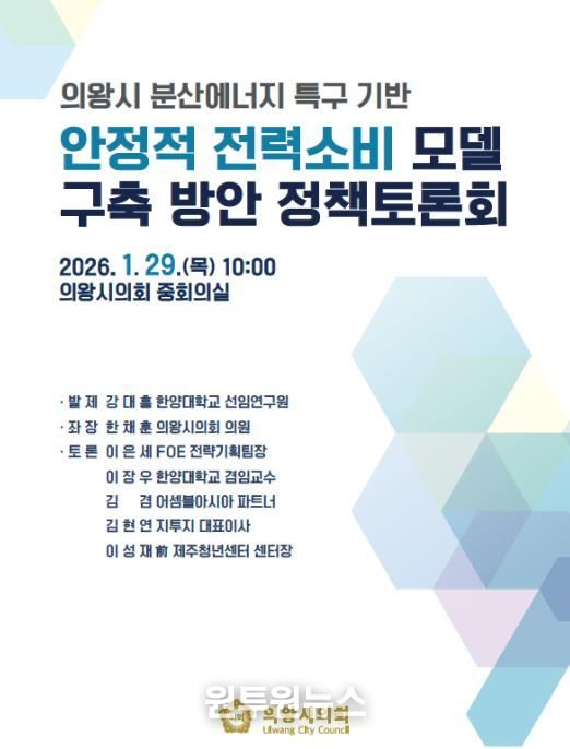 (원투원뉴스) 의왕시의회는 오는 29일 오전 10시, 시의회 중회의실에서 '의왕 분산에너지 특구 기반 안정적 전력소비 모델 구축 방안 정책토론회'를 개최한다고 밝혔다.