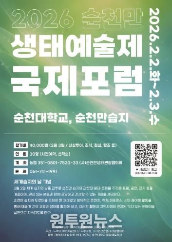 (원투원뉴스) 순천시는 세계 습지의 날을 맞아 2월 2일부터 2월 3일까지 순천대학교와 순천만습지 일원에서 ‘2026년 순천만 생태예술제 국제포럼’을 개최한다고 밝혔다.