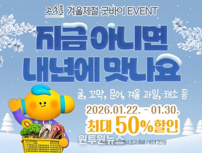 (원투원뉴스) 고흥군이 운영하는 온라인 쇼핑몰 고흥몰은 1월 22일부터 30일까지 겨울 제철 농수산물을 최대 50% 할인하는 특별 기획전 ‘지금 아니면 내년에 맛나요’를 개최한다.