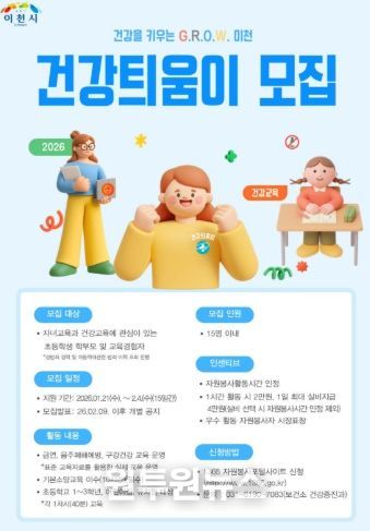 (원투원뉴스) 이천시는 2026년 초등학생, 어린이집 및 유치원 건강교육 프로그램인 ‘건강틔움’ 운영을 위한 아동 건강서포터즈를 1월 21일부터 2월 4일까지 모집한다고 밝혔다.