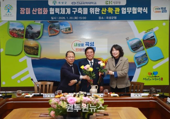 (원투원뉴스) 전남 곡성군은 장미산업화의 본격적인 추진을 위해 지난 20일 군청 소통마루에서 전남과학대학교, 주식회사 청화팜(대표 이화숙)과 함께 ‘곡성군 장미산업화 및 RISE 연계 산·학·관 협력체계 구축을 위한 업무협약’을 체결했다고 21일 밝혔다.