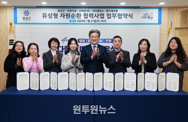 이번 협약은 어린이집과 기업이 협력해 고품질 재활용 자원을 회수하고, 새활용제품 소비와 체험 활동으로 연계하는 선순환 체계를 구축하기 위해 마련됐으며, 대전어린이집연합회 유성구지회·수퍼빈㈜·㈜재작소·앤드에코랩 등 8개 기관이 참여했다.