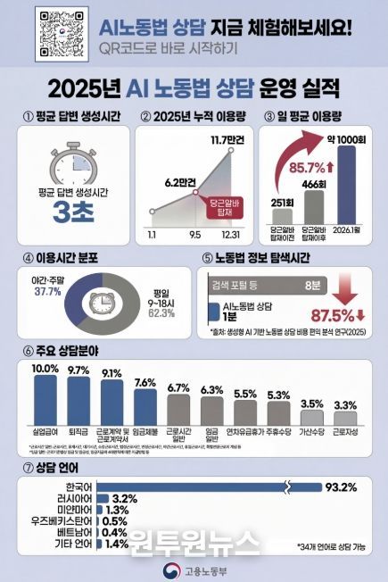 (원투원뉴스) 고용노동부는 21일 국민의 노동법 궁금증을 실시간으로 해결해 주는 ‘AI 노동법 상담’ 서비스의 2025년 운영 실적과 이용자 분석 결과를 발표했다. 지난 한 해 동안 총 11.7만 건의 상담을 처리하며, 노동 행정의 인공지능 전환(AX)을 성공적으로 이끌었다는 평가다.