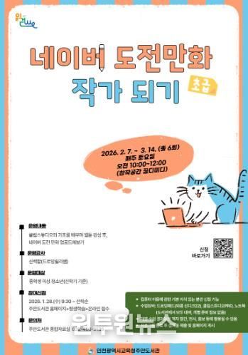 2월 강좌는 중학생 이상 청소년을 대상으로 디지털드로잉 실습 후 네이버 도전 만화에 업로드하는 ‘네이버 도전 만화 작가 되기’를 운영하며, 신청은 1월 28일부터 주안도서관 누리집에서 할 수 있다.