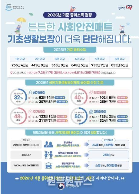 2026년 기준 중위소득이 4인 가구 기준 전년 대비 6.51% 인상됨에 따라, 생계·의료·주거·교육급여 등 국민기초생활보장 급여 수준도 함께 상향 조정된다.
