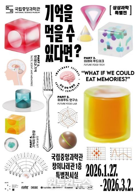 (원투원뉴스) 미래의 꿈을 만드는 과학 기술 문화 이음터(플랫폼) 과학기술정보통신부 국립중앙과학관은 겨울방학을 맞아 과학적 상상력이 미학적 체험으로 실현되는 과정을 그린 상상 과학 특별전 '기억을 먹을 수 있다면?(What If We Could Eat Memories?)'을 2026년 1월 27일부터 3월 2일까지 창의 나래 관 1층 기획전시실에서 개최한다고 밝혔다.