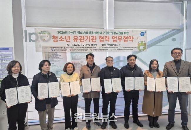 김대권 수성구청장은 “청소년 중독 문제는 단일 기관의 노력만으로는 한계가 있는 만큼 지역사회 유관 기관 간 협력이 무엇보다 중요하다”며 “이번 협약을 통해 위기청소년이 적시에 보호받고, 회복과 자립으로 이어질 수 있는 통합적 지원체계를 강화해 나가겠다”고 말했다.
