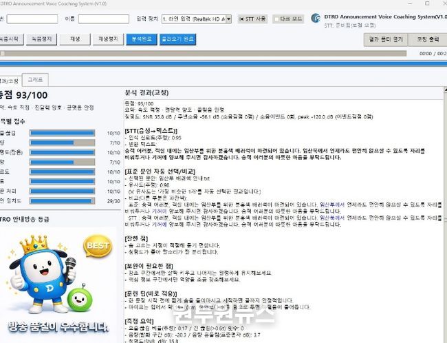 해당 프로그램은 AI 기술을 활용해 기관사의 안내방송 음성을 즉각 분석하고 맞춤형 피드백을 제공하는 시스템이다. 호흡, 속도, 억양 등 7개 음성 지표를 분석해 객관적인 평가 결과를 산출하며, 특히 음성-텍스트 변환(STT: Speech-to-Text) 기술을 적용해 표준 문안과의 일치 여부까지 정밀하게 검증한다.