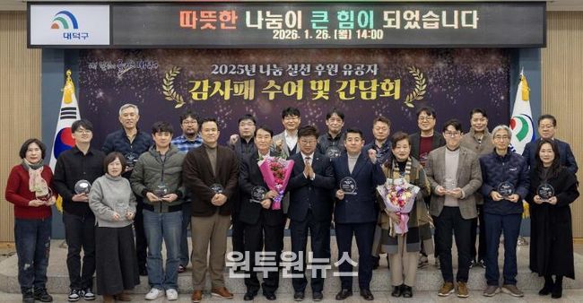 대덕구는 26일 구청 대회의실에서 2025년 어려운 이웃돕기에 적극 참여한 나눔 실천 유공자들을 대상으로 감사패 수여식과 간담회를 개최했다.