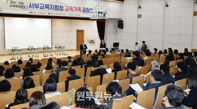 (원투원뉴스) 광주시교육청은 26일 광주시교육청교육연수원 중강당에서 서부권 교직원, 학부모, 시민 등을 대상으로 ‘광주·전남 교육행정통합’ 추진 현황 공유 및 의견 청취를 위한 공청회를 개최했다.