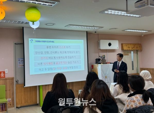 (원투원뉴스) 동보초등학교(교장 최덕기)는 1월 22일, 공립행복하나어린이집(원장 이수연) 학부모 12명을 대상으로 어초음이음교육의 일환으로 1학년 신입생 학부모 연수를 실시했다.