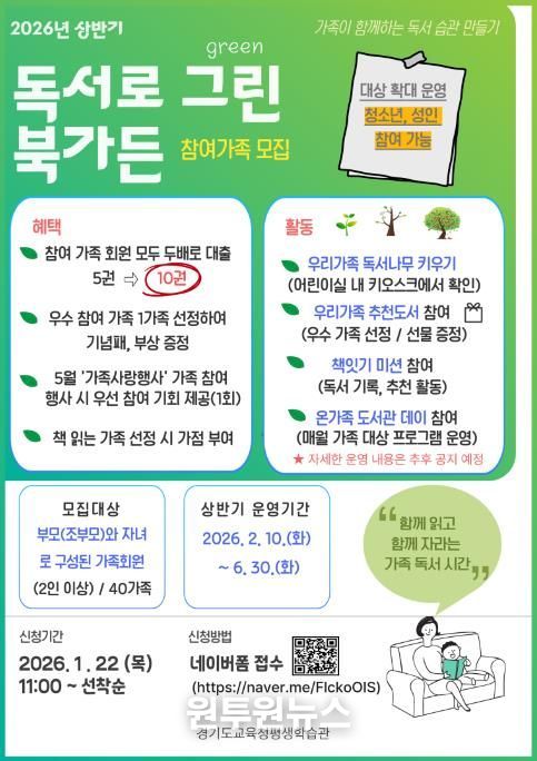 류영신 경기도교육청평생학습관장은 “이번 프로그램을 통해 가정 내 독서 문화가 자연스럽게 확산되고 책을 중심으로 한 소통과 활동을 통해 가족 간 유대감이 한층 강화되기를 기대한다”고 말했다.