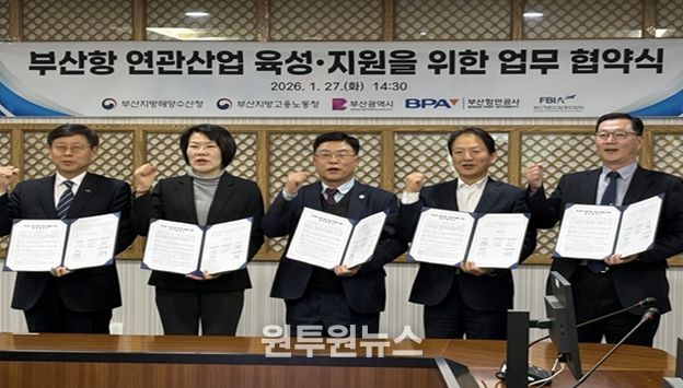 (원투원뉴스) 부산시는 27일 오후 2시 30분 부산항만공사 중회의실에서 부산지방해양수산청, 부산지방고용노동청, 부산항만공사, 부산항만산업총연합회와 '부산항 항만연관산업* 육성·지원을 위한 업무협약'을 체결했다고 밝혔다.