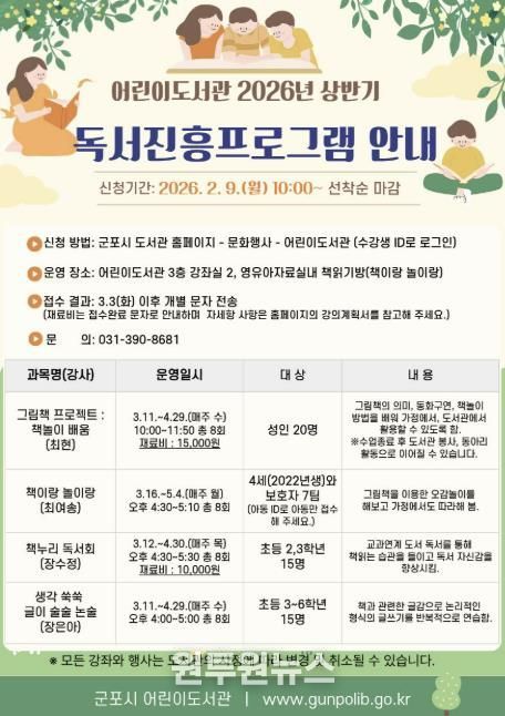 군포시 어린이도서관 관계자는 “이번 봄학기 독서진흥프로그램은 어린이들이 또래와 함께 독서 역량을 키울 수 있도록 기획했으며, 성인강좌를 통해 가정과 도서관이 함께하는 독서환경을 조성하고자 한다”며 “시민들의 많은 관심과 참여를 바란다”고 말했다.