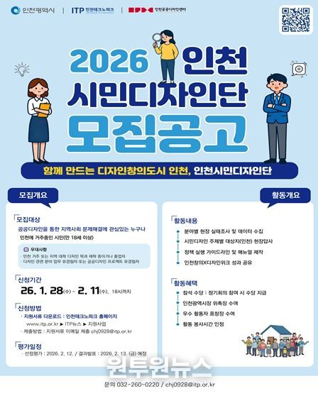 (원투원뉴스) 인천광역시는 1월 28일부터 2월 11일까지 시민 중심의 공공디자인 혁신을 이끌 ‘인천시민디자인단’을 모집한다고 밝혔다.