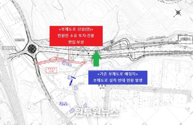 국민권익위는 현장 조사에서 주민들의 다양한 의견을 수렴한 결과, 부체도로 설치 예정지 인근에 거주하는 주민이 부체도로 설치를 반대하는 또 다른 민원이 있음을 확인했다. 이에 당초 설계된 부체도로 설치 위치를 사업부지와 가장 가까운 민원인의 거주지로 변경해 해당 토지·건물을 사업 지구에 편입·보상하는 방안을 도출했다.