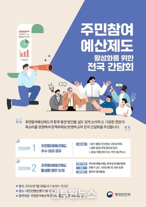 (원투원뉴스) 행정안전부는 1월 28일, 대전컨벤션센터에서 ‘주민참여예산제도 활성화를 위한 전국 간담회’를 개최한다고 밝혔다.