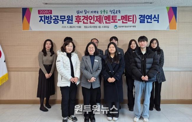 (원투원뉴스) 경상북도청송교육지원청은 28일 청송교육지원청 2층 소회의실에서 관내 2026년 1월 1일 자 신규 임용 지방공무원 5명과 선배 공무원들이 참석한 가운데 '지방공무원 후견인제(멘토링) 멘토-멘티 결연식'을 개최했다.