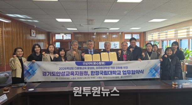 (원투원뉴스) 경기도안성교육지원청은 2026년 1월 28일, 경기도안성교육지원청에서 한경국립대학교와 함께 안성 관내 다문화교육 활성화 및 이주배경학생 역량 강화를 위한 업무협약(MOU)을 체결했다.