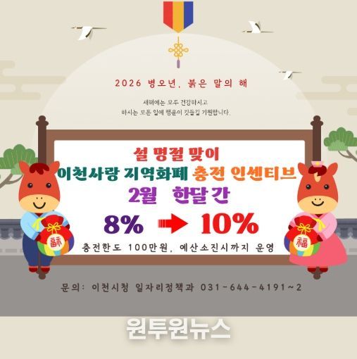 (원투원뉴스) 이천시는 설 명절을 맞아 지역경제 활성화와 소상공인 매출 증대를 위해 2026년 2월 한 달간 이천사랑지역화폐 충전 인센티브를 기존 8%에서 10%로 상향한다고 밝혔다.