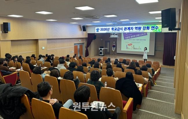 (원투원뉴스) 충청북도영동교육지원청은 28일 영동교육지원청 학교지원센터 3층 시청각실에서 관내 유·초·중·고등학교 조리사, 조리실무사 70여 명을 대상으로 ‘2026년 학교급식 관계자 역량강화 연수’를 시행했다.
