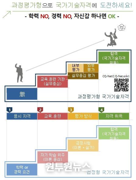 또한, 교육·훈련을 통해 실무 역량을 키워나가는 만큼 별도의 응시자격을 먼저 요구하지 않아 경력이 없는 사람이나 비전공자도 산업기사 이상 자격에 도전할 수 있다. 과정평가형 국가기술자격을 취득하기 위해서는 직업계고, 대학, 폴리텍 등 교육기관에서 개설되는 과정에 참여하거나, 직업훈련기관에서 국민내일배움카드로 교육·훈련을 신청하여 수강할 수 있다.